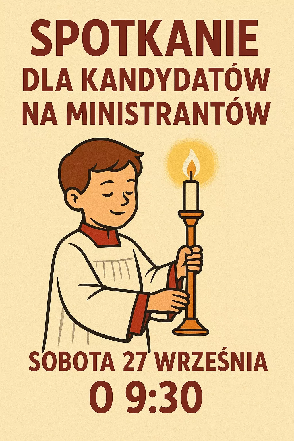 Serdecznie zapraszamy chłopców, którzy chcieliby zostać ministrantami, na spotkanie organizacyjne w sobotę 27 września o godz. 9.30. To doskonała okazja, aby dołączyć do grona ministrantów i rozpocząć piękną służbę przy ołtarzu.