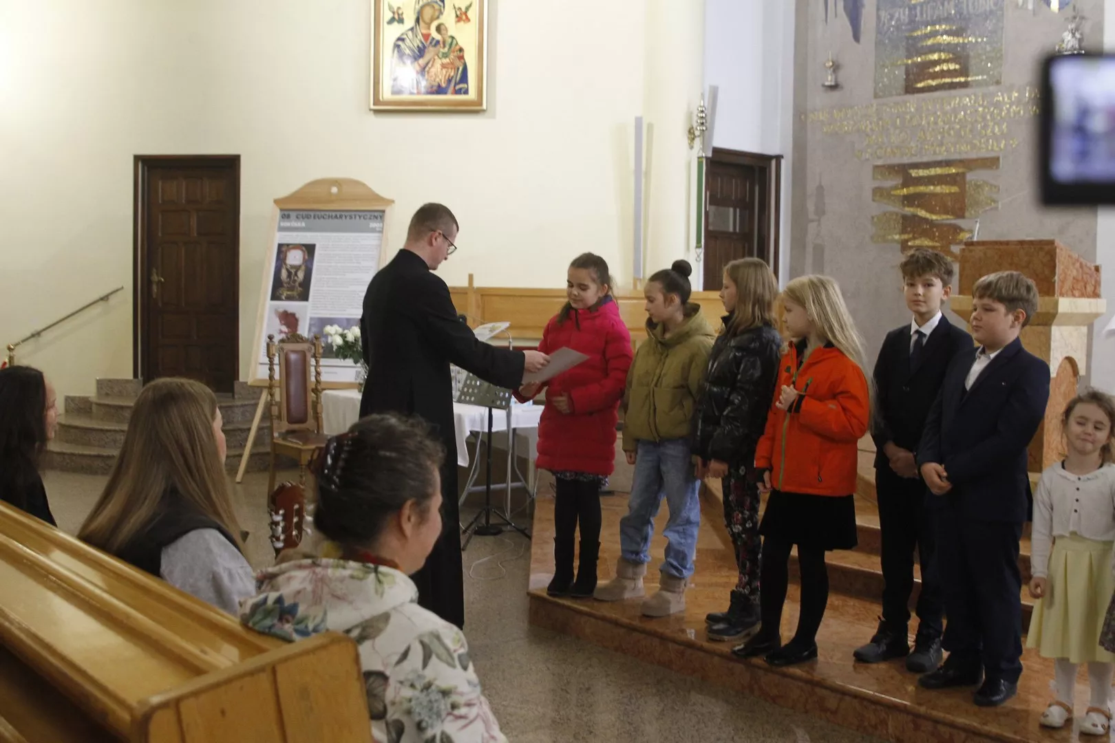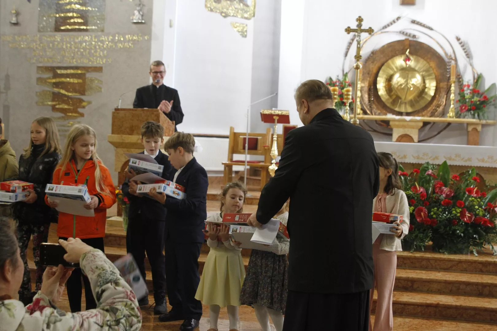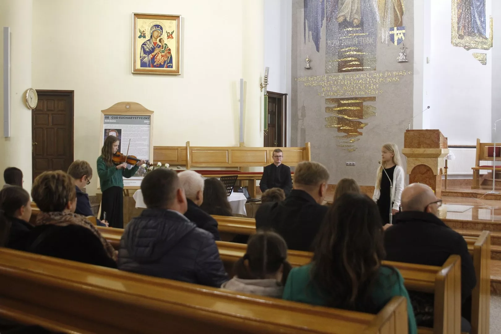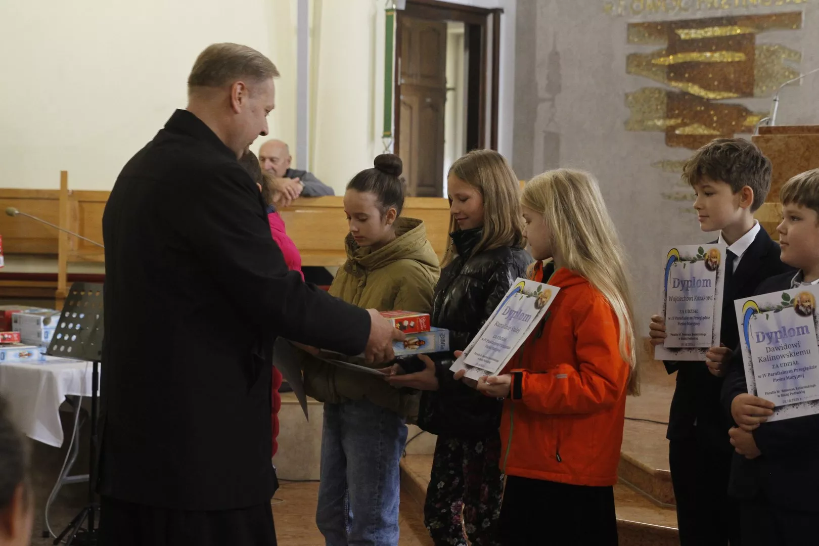 Na IV przeglądzie Pieśni Maryjnych, który odbył się 26 października po Mszy Świętej o godz. 9.00 w naszej parafii, Ksiądz Mariusz Nejranowski na początku powitał wszystkich uczestników i tych, którzy po Mszy św. pozostali, aby wysłuchać pieśni. Zaśpiewano dziewięć pieśni.