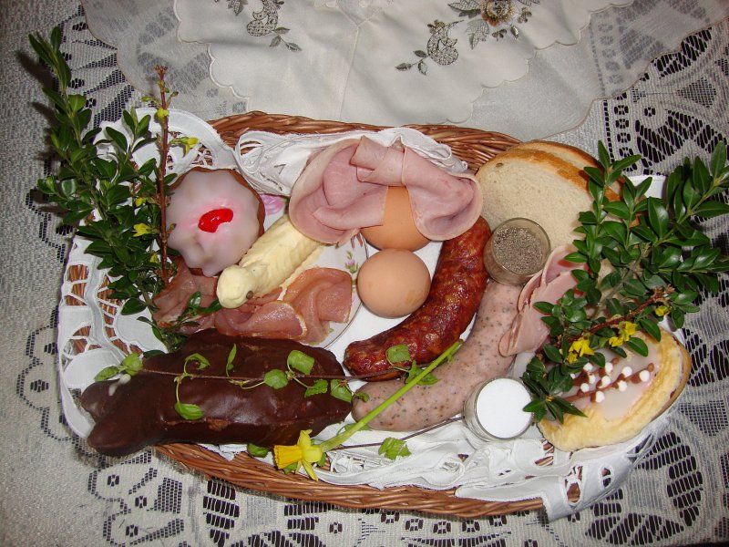 W Niedzielę Wielkanocną po Mszy św. rezurekcyjnej gromadzimy się wszyscy na uroczystym śniadaniu przy odświętnym stole, przybranym gałązkami, baziami wierzbowymi, zieloną pszenicą, rzeżuchą albo bukszpanem, które symbolizują nowe życie otrzymane na Chrzcie św. Na środku stołu umieszczamy paschał rodzinny, baranka wielkanocnego oraz „święcone”. Spożywanie pokarmów winna poprzedzić wspólna modlitwa o Boże błogosławieństwo, o dary Ducha Świętego dla naszego papieża Benedykta XVI, o łaskę nawrócenia dla niewierzących, o pokój na ziemi, o pociechę dla cierpiących i samotnych.