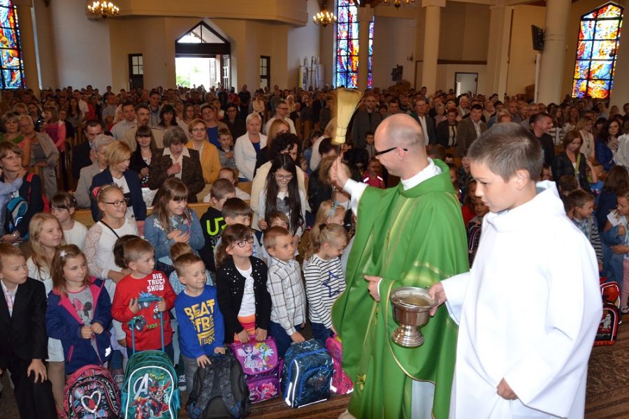 Na Mszy Świętej o godz. 13.00 ks. Jacek poświęcił uczniom klas I tornistry i przybory szkolne